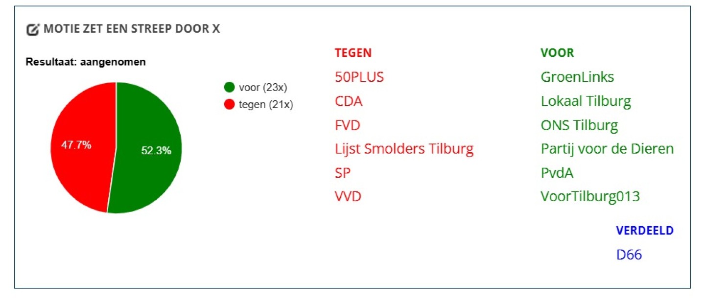Burgemeester Weterings noemt het goed om een statement te maken en zegt dat ook het college daarom van X af wil. De motie van Janssen redt het uiteindelijk maar net, met 23 stemmen voor en 21 stemmen tegen. Het X-account van de gemeente wordt op inactief gezet, om te voorkomen dat kwaadwillenden zich op X als de gemeente voordoen.