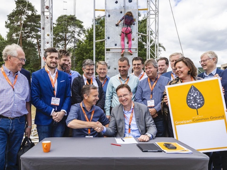 De ondertekening van het Groeipact Common Ground op het iBestuur-congres van 3 juli, met Maarten Hillenaar (staand, vijfde van links) en René Bal (staand, zevende van links). Beeld: De Beeldredaktie