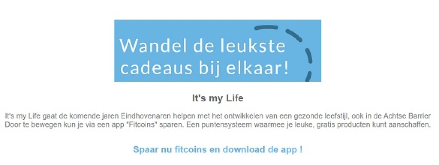 It’s my Life! koppelt hun Fitcoin-app aan de stappenteller op de telefoon van de deelnemer. Iedere duizend stappen en/of 15 minuten fietsen worden beloond met punten die deelnemers in de app kunnen inwisselen voor gezonde cadeautjes. De gemeente Eindhoven gebruikt Fitcoin om haar medewerkers te stimuleren om meer te bewegen. Gemeente Oosterhout zet de app sinds april dit jaar in voor jongeren tussen de 12 en de 20 jaar oud.