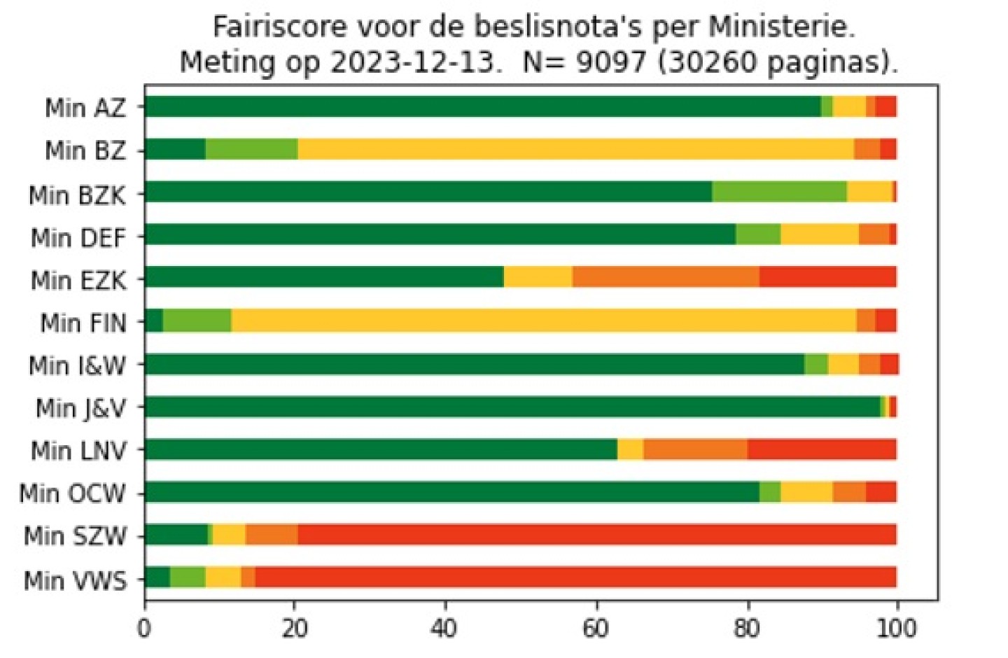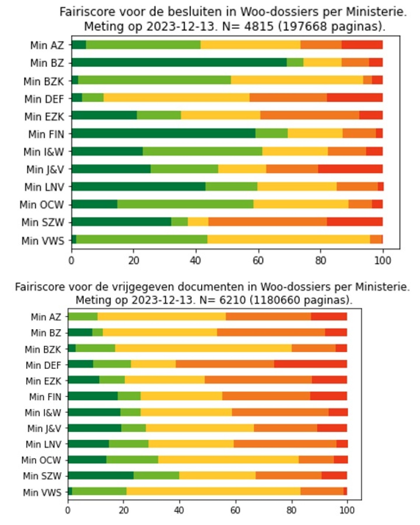 In de tabellen hiernaast staat de kwaliteit van de stukken per ministerie weergegeven op een manier die is afgeleid van de Nutriscore. De groene score A staat voor een digitaal document, alle andere voor ingescande documenten. De score geeft aan hoeveel de machine leesbare tekst lijkt op het origineel. Hoe roder, hoe minder leesbaar. Stukken met de rode score E bevatten geen enkel machine leesbaar karakter.