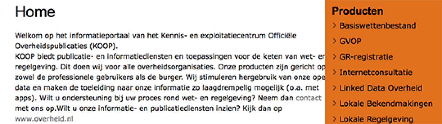 Nou, heel veel. Op de homepage vertelt KOOP dat het publicatie- en informatiediensten biedt en toepassingen voor de keten van wet- en regelgeving.