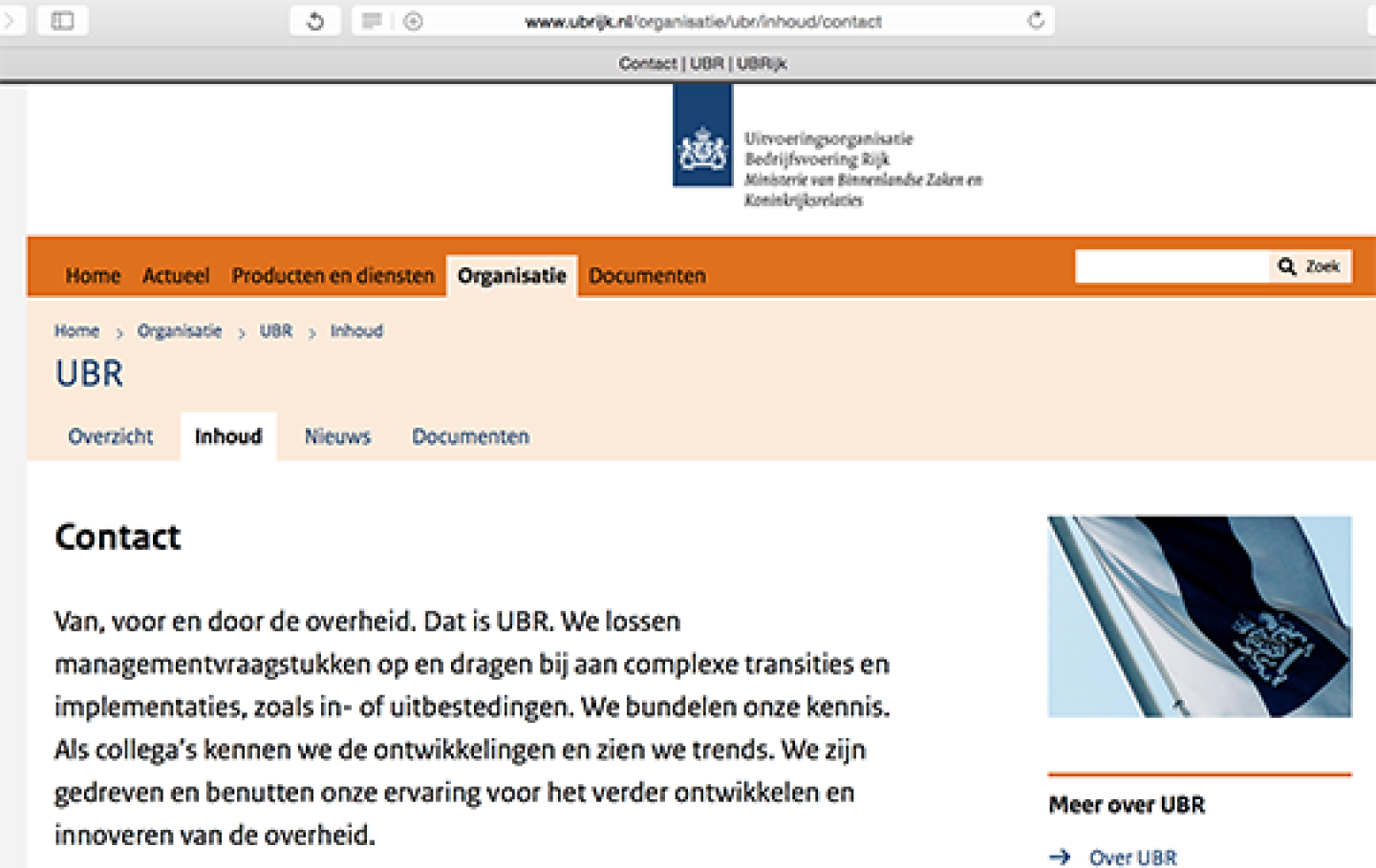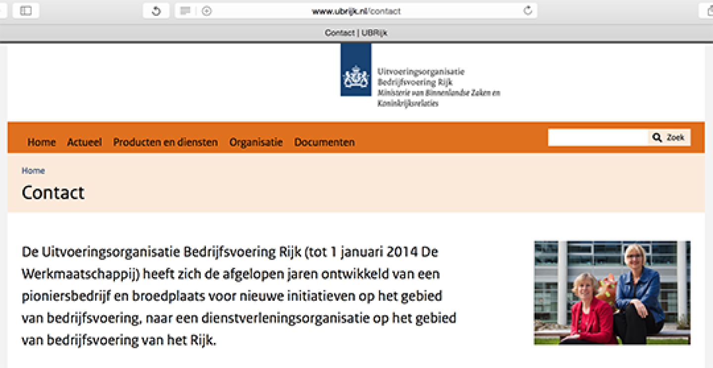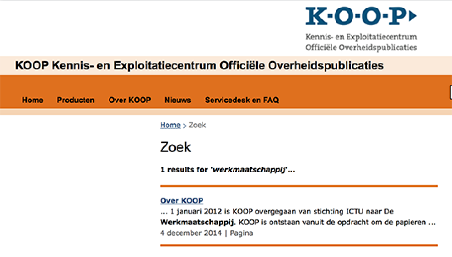 1 results for ‘werkmaatschappij‘… En dat ene results hadden we al gezien: KOOP is vier jaar terug van ICTU naar De Werkmaatschappij gegaan. Je moest dus nog even verder zoeken. Misschien op de UBR-website, als die bestond. Op de KOOP-site had ik tevergeefs naar een link gezocht. Maar er bleek een UBR-website te zijn. En ja hoor, als je daar ‘werkmaatschappij’ intikt word je verwezen naar de contactpagina. Daar staat: “De Uitvoeringsorganisatie Bedrijfsvoering Rijk (tot 1 januari 2014 De Werkmaatschappij) heeft zich de afgelopen jaren ontwikkeld van een pioniersbedrijf en broedplaats voor nieuwe initiatieven op het gebied van bedrijfsvoering, naar een dienstverleningsorganisatie op het gebied van bedrijfsvoering van het Rijk.” Twee vliegen in één klap. De Werkmaatschappij bestaat dus nog wel, maar heet inmiddels anders, en UBR staat voor Uitvoeringsorganisatie Bedrijfsvoering Rijk. Het was een pioniersbedrijf en broedplaats, maar nu is het een dienstverleningsorganisatie.