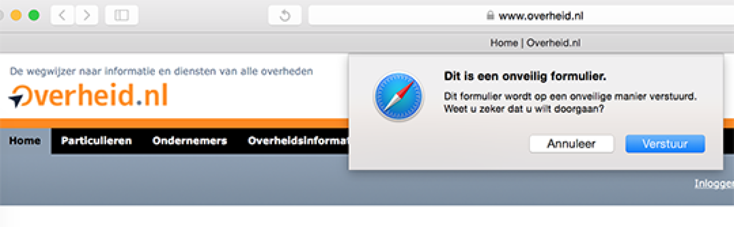 Dus op de homepage van Overheid.nl wordt je verteld dat je een onveilig formulier dreigt te versturen dat door anderen kan worden gelezen, en tegelijkertijd dat de informatie privé blijft. Hoe kan dat?