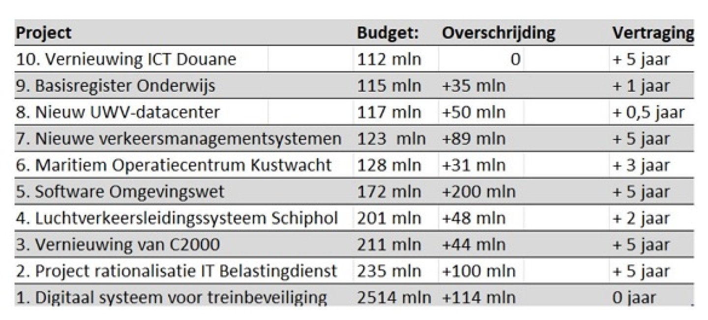 - Erfenissen van uit het verleden; 8 van de 10 duurste projecten zijn opgestart in de periode 2014 en 2016. ‘Terwijl het bedrijfsleven overstapte naar ‘lean en agile’, bleef de overheid kiezen voor groots opgezette projecten. IT-projecten werden in de jaren erna kritischer bekeken dan ooit en beoordeeld door externe bureaus en toezichthouders, zoals bureau BIT (nu AcICT). Vrijwel ieder project uit de top 10 moest na de start opnieuw naar de tekentafel omdat verschillende randvoorwaarden voor een succesvolle implementatie bleken vergeten.’
