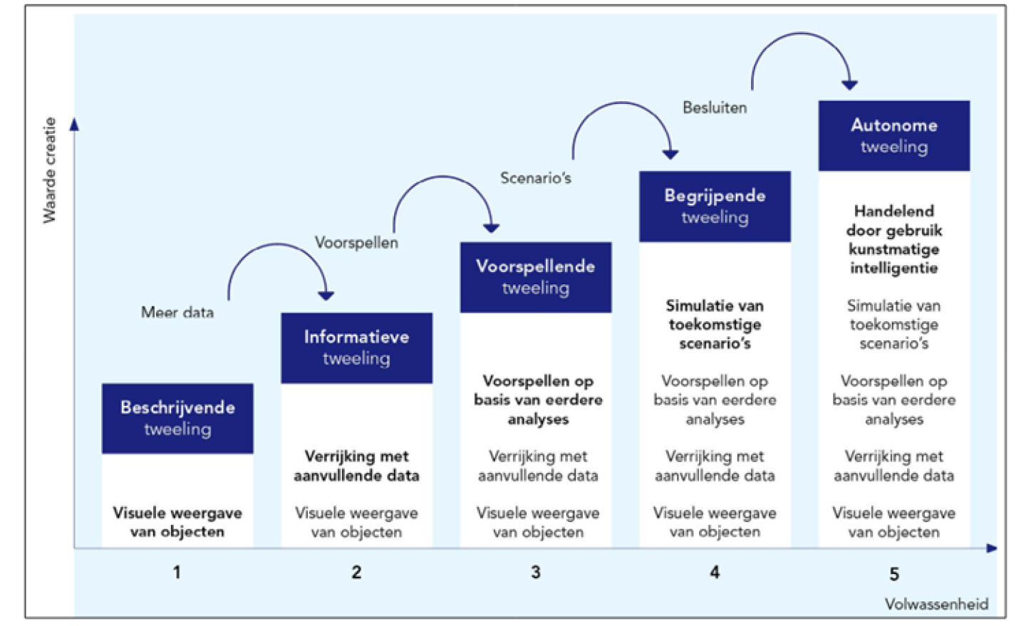 De vijf fasen van volwassenheid van digital twins, bron: VNG position paper 'Digital twins op weg naar gemeenten'