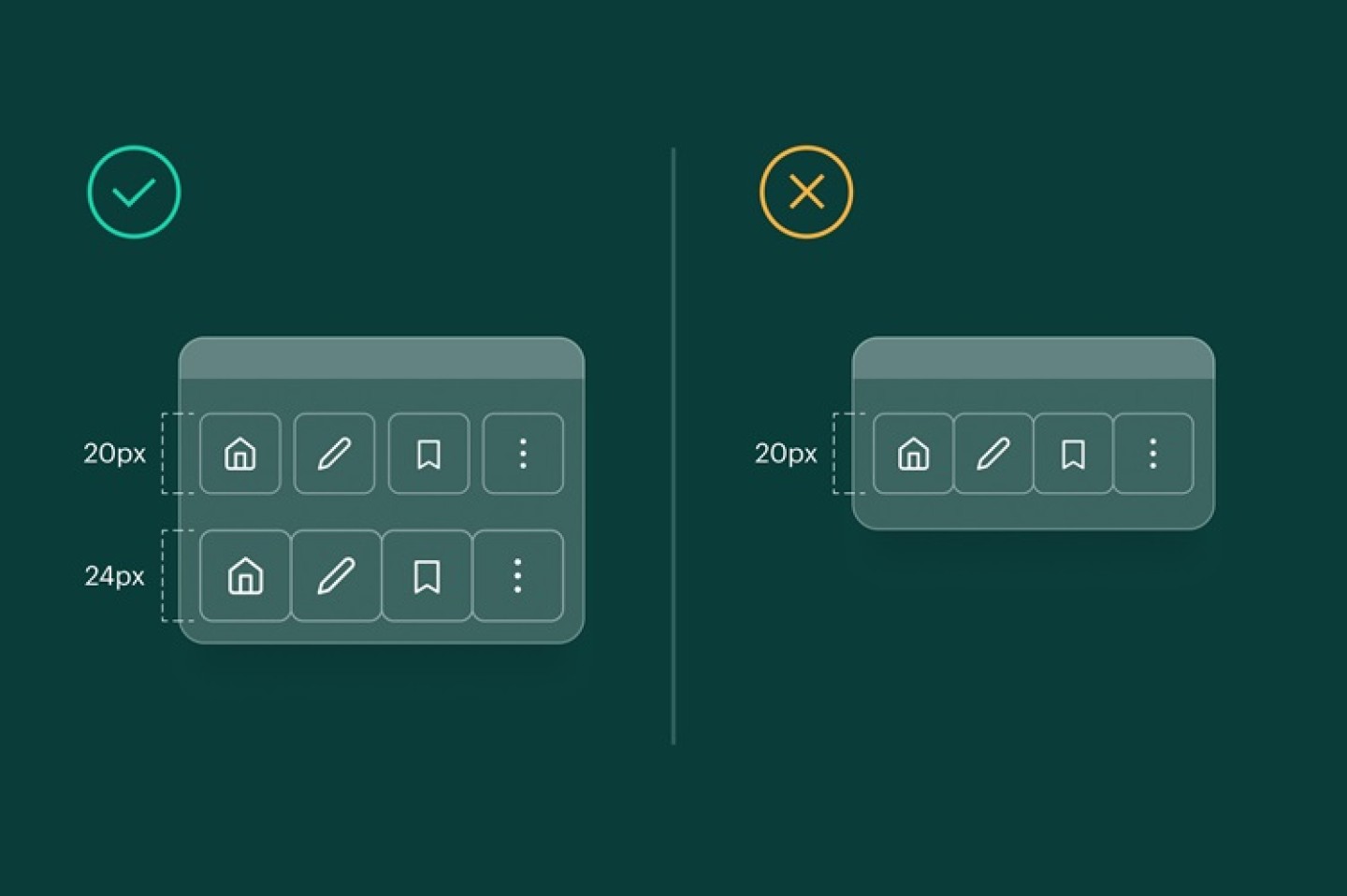 Een knop moet je kunnen bedienen vanaf een smartphone of touchscreen, daarom mogen de knoppen niet te dicht bij elkaar staan. De grootte van een knop moet minimaal 24 x 24 pixels zijn. Zijn ze kleiner dan moeten deze knoppen uit elkaar staan, zodanig dat als je een cirkel om de knop tekent van een diameter van 24 pixels, deze cirkels elkaar niet mogen overlappen.