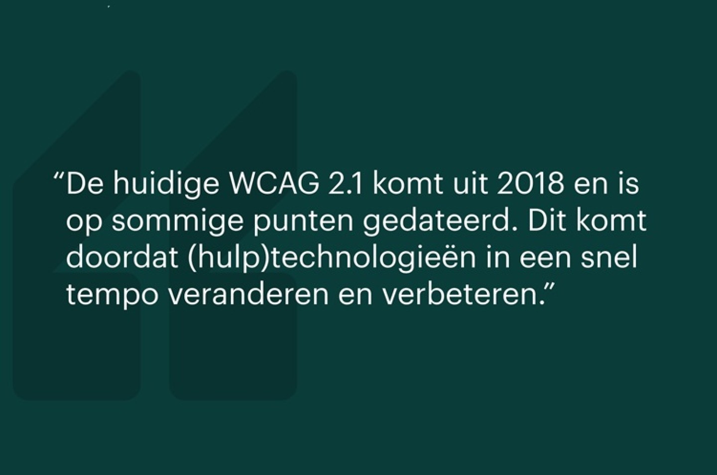 De huidige WCAG 2.1 komt uit 2018 en is op sommige punten gedateerd. Dit komt doordat (hulp)technologieën in een snel tempo veranderen en verbeteren.