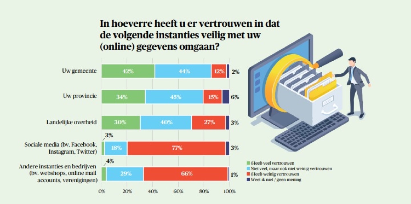 Inwoners hebben het meeste vertrouwen in de dataveiligheid van gemeenten (42 procent), daarna volgen provincies (34 procent) en pas daarna komt de landelijke overheid (30 procent). Het minst vertrouwen hebben ze in de omgang met data door sociale media en webwinkels.