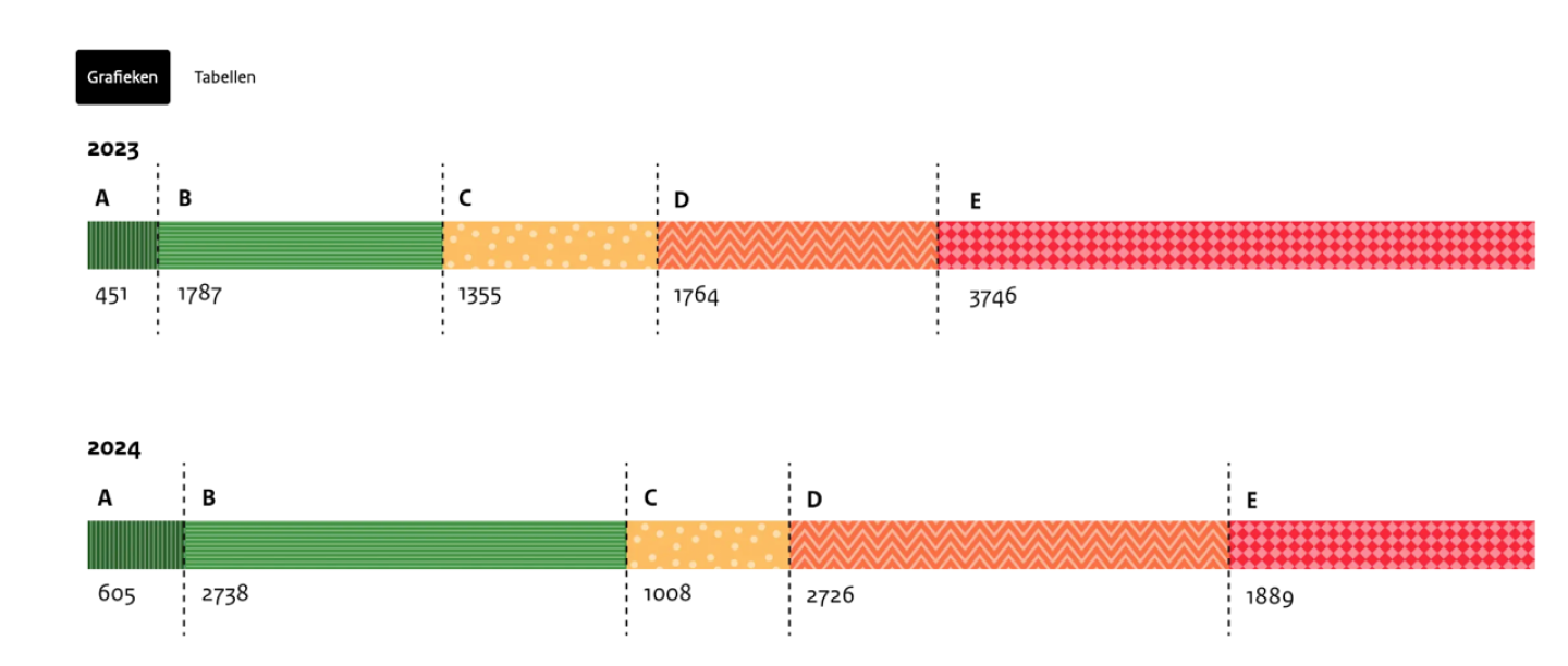 In de categorieën met A- en B-statussen was een groei zichtbaar van respectievelijk 34 en 53 procent. Verder is de categorie met status E gehalveerd, maar nam het aantal websites en apps in de categorie met status D juist toe met 50 procent. De verschuivingen zijn deels te verklaren doordat leveranciers van websites en apps beter meewerken aan het opstellen van de toegankelijkheidsverklaringen.