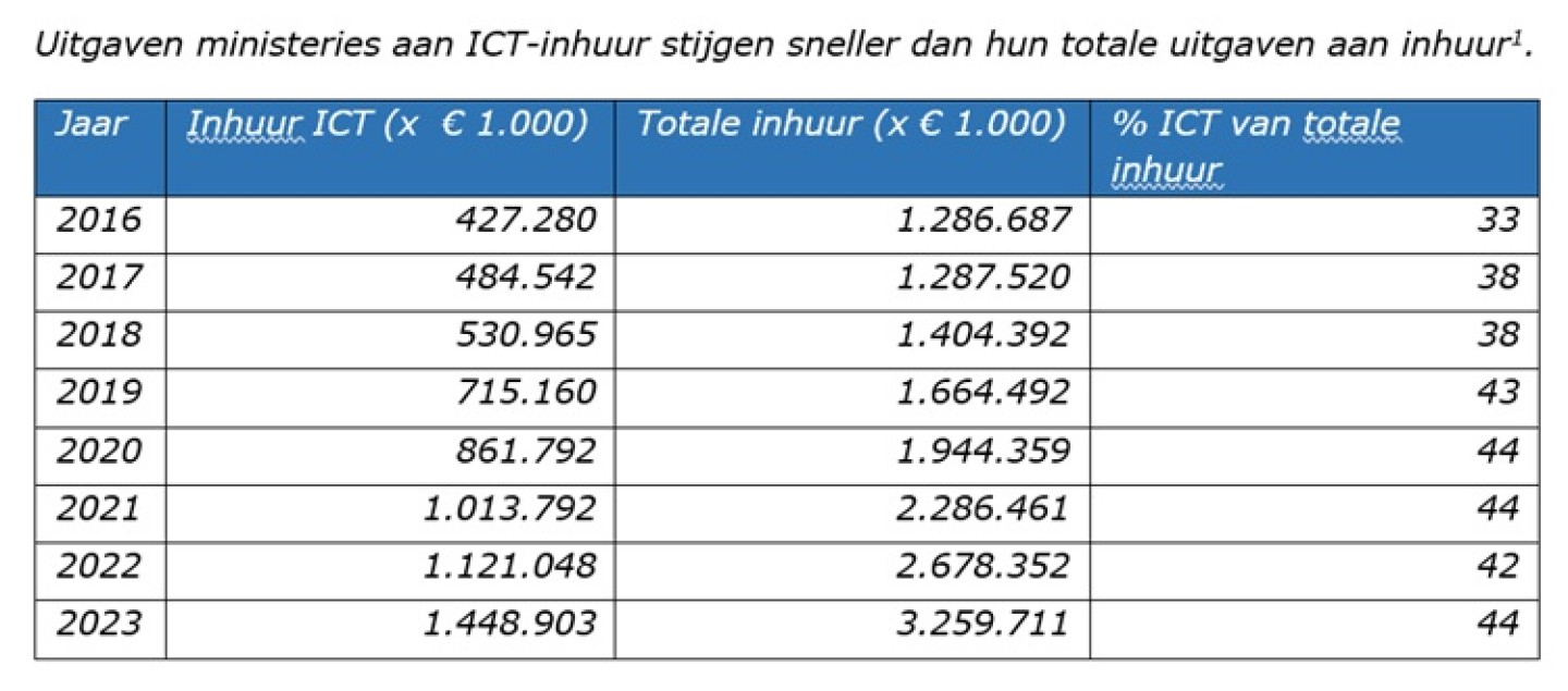 Het Rijk gaf in 2022 € 4.9 miljard uit aan ICT; € 400 miljoen meer dan het jaar daarvoor. Een belangrijk deel betreft inhuur vanuit de markt. In 2023 was dat ruim € 1,4 miljard, oftewel 44% van de totale inhuur. De Roemernorm dat de kosten van externe inhuur in principe maximaal 10% bedragen van de totale personeelsuitgaven, wordt voor ICT fors overschreden.