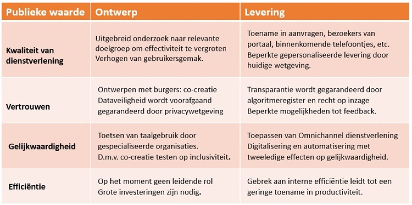 Ook is gevraagd in welke mate er een conflict bestaat tussen deze verschillende waarden en hoe daarmee wordt omgegaan. Zo kan een hogere mate van efficiëntie door middel van algoritmegebruik afbreuk doen aan vertrouwen en gelijkwaardigheid, zoals het geval was bij het fraudeopsporingsmechanisme van de Belastingdienst.