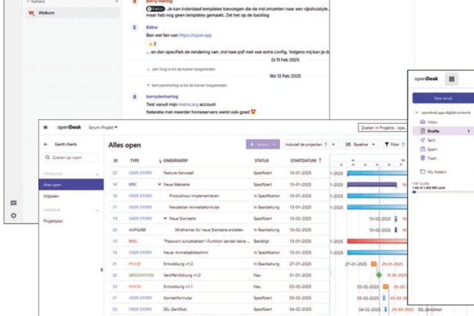 De verleiding is groot om nu in clichés te vervallen, want waar de Duitsers strak te werk gaan, is de Franse software met meer vrijheid ontwikkeld. Interessant genoeg vormt de open source software een reflectie van de manier waarop de politiek van het land in kwestie is georganiseerd. ‘De Duitse oplossing is meer federatief van aard, net als de Duitse politiek', zegt Hooft. ‘De Fransen kiezen voor een centrale oplossing. Het gebeurt allemaal in Parijs. Hetzelfde zie je terug in de structuur van hun software.’ De Franse oplossing is flexibeler dan de Duitse, met één authenticatielaag waaraan diverse losse componenten worden gekoppeld, maar vormt minder één geheel. De Franse oplossing La Suite numérique is al vijf jaar in ontwikkeling en bevat onder meer de berichtendienst Tchap, die door meer dan 600.000 ambtenaren wordt gebruikt. Van La Suite gebruikt Mijn Bureau Chat, Docs en Meet. De eerste versie van de Duitse oplossing openDesk, ontwikkeld door Zentrum Digitale Souveränität (ZenDiS) in opdracht van het Duitse Federale ministerie van binnenlandse Zaken, is in januari van 2025 uitgebracht. Van openDesk gebruikt Mijn Bureau de Files, Email, Kalender, Taken, Projecten en Kennis.