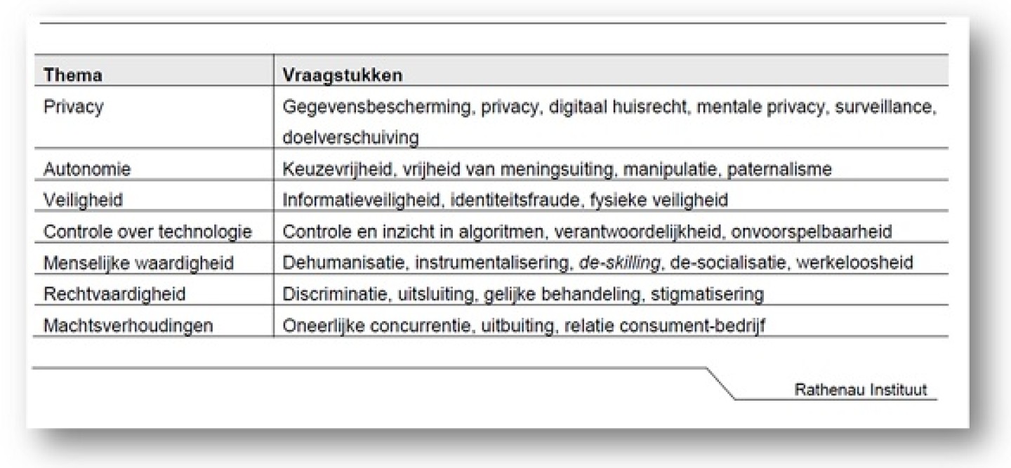Een thema dat niet genoemd wordt in het overzicht van het Rathenau Instituut betreft duurzaamheid voor natuur en milieu. Met de discussie over energieslurpende mega- datacenters eveneens een noodzakelijk thema dat om actie vraagt.