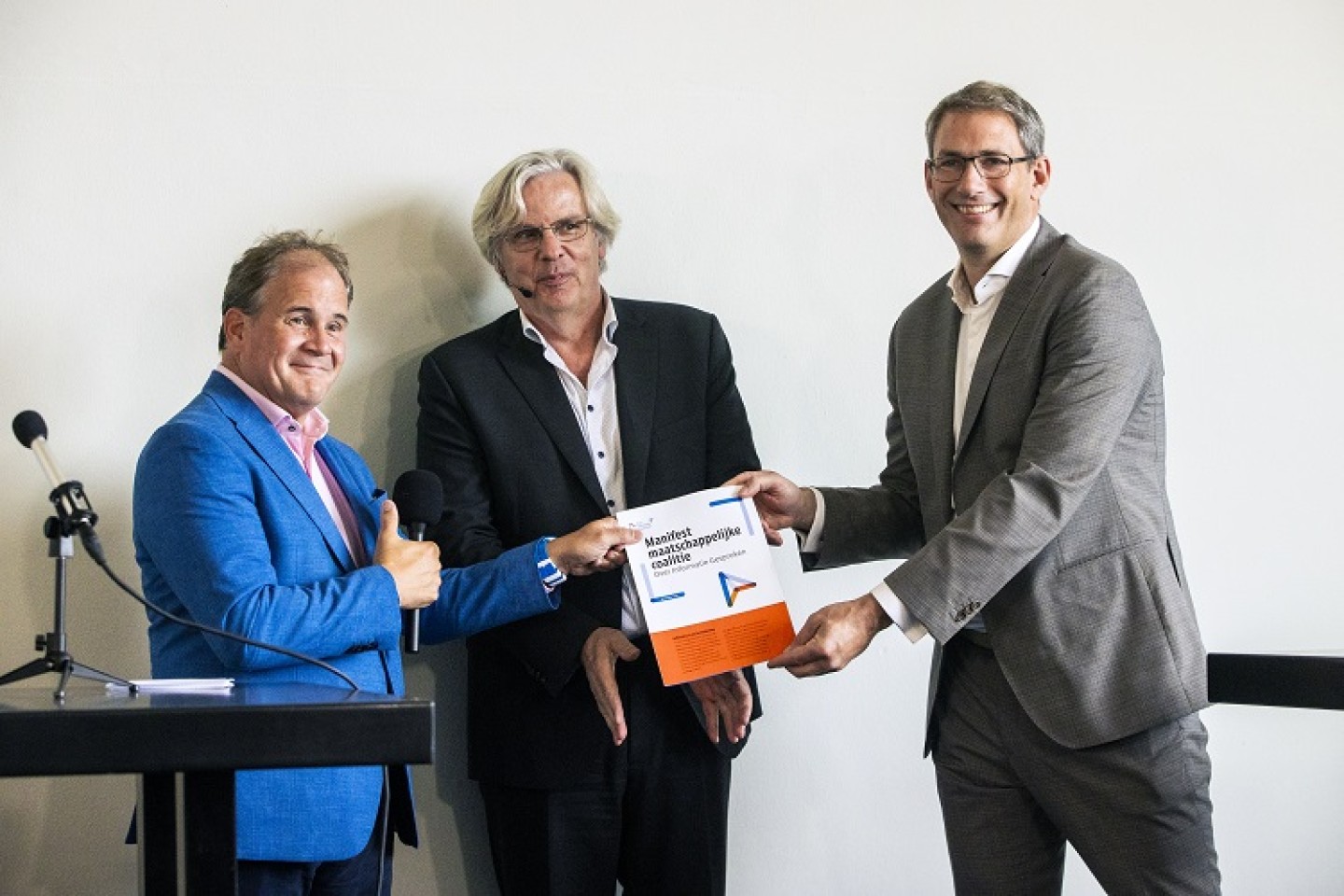 Tussen de gesprekken door overhandigt voorzitter Eppo van Nispen tot Sevenaer namens de maatschappelijke coalitie Over Informatie Gesproken een manifest aan Nathan Ducastel, directeur VNG Realisatie. Informatie moet niet alleen beschikbaar, betrouwbaar en begrijpelijk zijn, maar ook vindbaar en toegankelijk, aldus het manifest. De oproep voor transparantie in de ambtelijke eed, spreekt hem dan ook aan.
