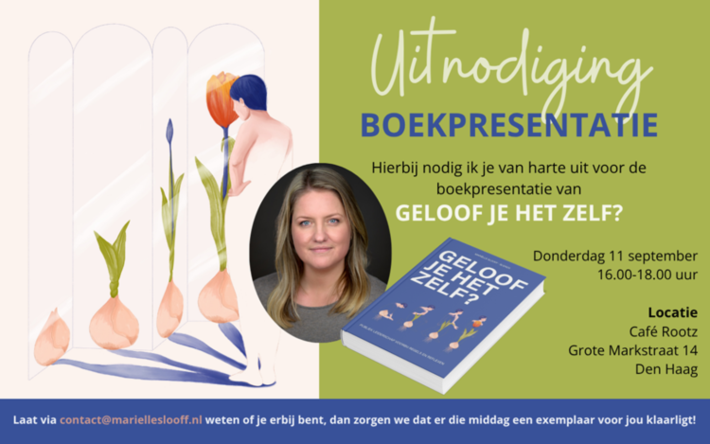 Op 11 september vindt de boekpresentatie plaats van 'Geloof je het zelf? Laat via contact@marielleslooff.nl weten of je erbij bent, dan ligt er 's middags een exemplaar voor je klaar.
