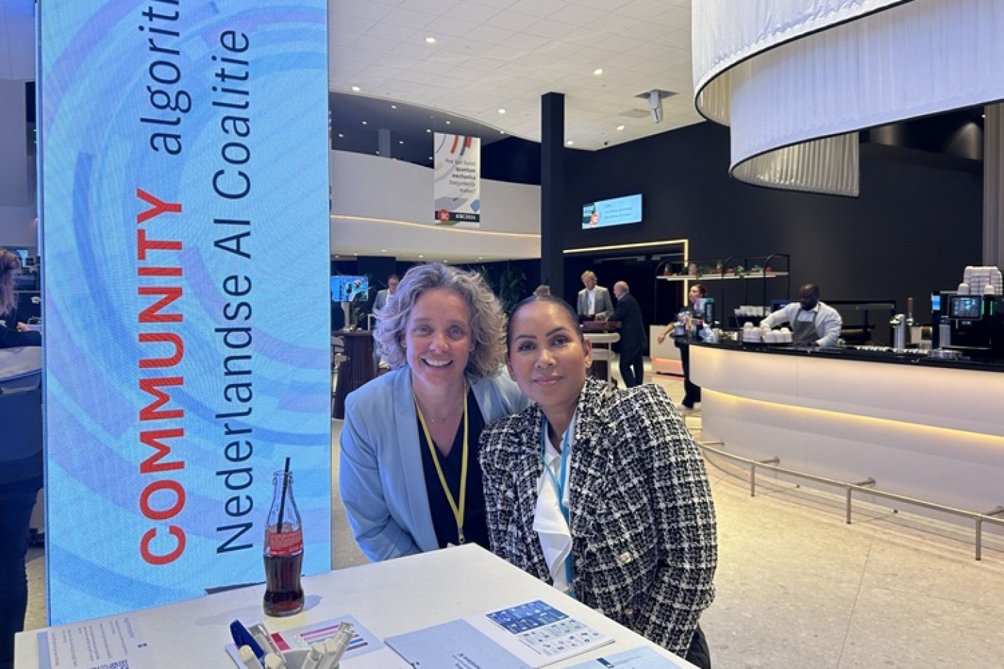 'Het was ouderwets IRL netwerken vandaag op het iBestuur Congres, schrijft Elja Daae (links) op LinkedIn. 'Vooral bij de algoritme/generatieve AI/NLAIC zuil! Daar stonden we klaar om in gesprek te gaan over het leukste onderwerp van het congres 😄. Mét prachtige analoge flyers (daar kan geen AI tegenop).'