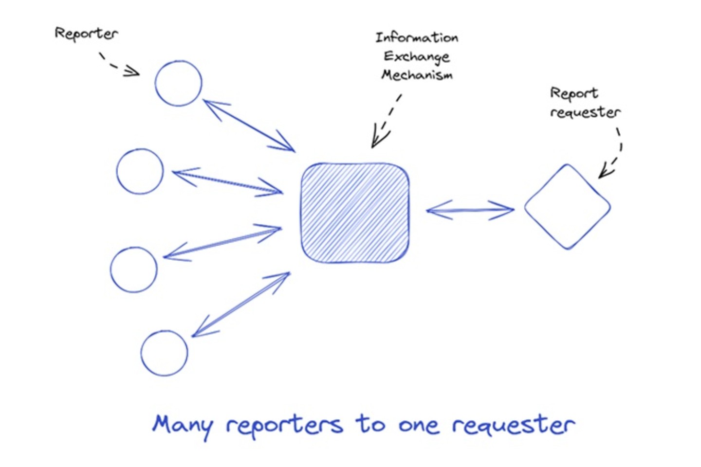 In het eerste patroon verstrekken meerdere rapporterende partijen gegevens aan één uitvragende organisatie. Dit komt vaak voor wanneer talrijke partijen een rapportageverplichting hebben aan een centrale overheidsinstantie. Een voorbeeld hiervan is de verzameling van jaarverslagen door de Kamer van Koophandel.