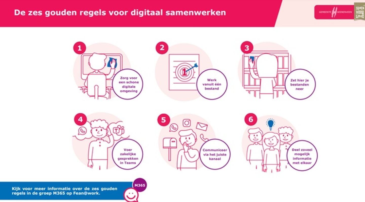 De eerste stap was uitzoeken welke praktische regels het beste werken voor de manier waarop de gemeente Heerenveen werkt. Mensen van verschillende disciplines dachten hierover na. In dat team zaten onder andere ict’ers, ambassadeurs (‘key users’), en de gemeentesecretaris. Vervolgens koos de gemeente voor het scenario Samenwerken in Teams. Een praatplaat met de zes gouden regels voor digitaal samenwerken moest de nieuwe manier van werken tussen de oren krijgen (zie kader). Volgend jaar gaat Heerenveen van de netwerkschijf over naar werken Sharepoint. Een spannende stap, geeft Wijnholds toe, maar een die hij met vertrouwen tegemoetziet dankzij de geleerde lessen uit dit eerste traject.