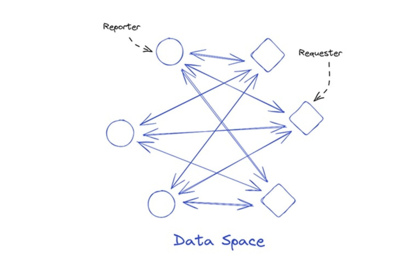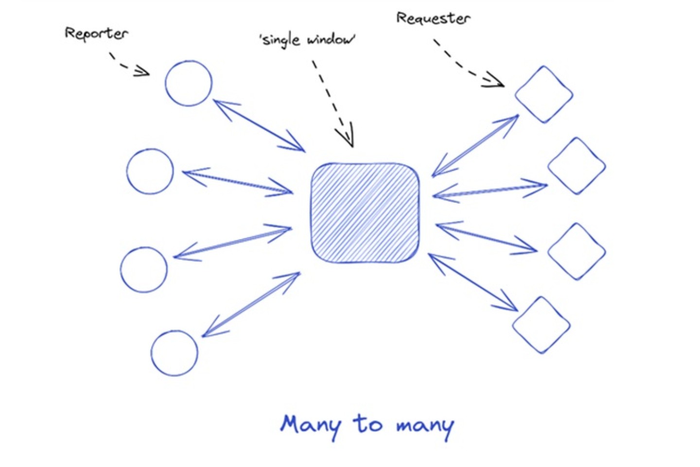 In het eerste patroon verstrekken meerdere rapporterende partijen gegevens aan één uitvragende organisatie. Dit komt vaak voor wanneer talrijke partijen een rapportageverplichting hebben aan een centrale overheidsinstantie. Een voorbeeld hiervan is de verzameling van jaarverslagen door de Kamer van Koophandel.