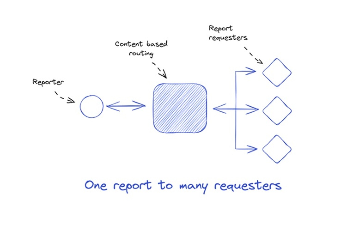 Het derde patroon ontstaat wanneer een rapporterende partij eenmalig gegevens verstrekt aan meerdere (overheids)instanties. In dergelijke gevallen kunnen deelverzamelingen van gegevens worden verspreid op basis van specifieke interesses, waarbij gebruik wordt gemaakt van een concept dat bekend staat als content based routing. Bijvoorbeeld, gegevens over geïmporteerde goederen kunnen worden verspreid naar de belastingdienst, de douane en (lucht)havenautoriteiten.